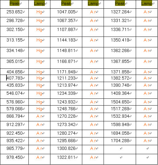 我们的光谱仪经过仔细的校准。但是,随着时间推移和环境的改变,波长会发生轻微的漂移。如果波长精度对于你的应用来说比较重要的话,你可以考虑每次都校准波长。 您可以重新调整光学光谱仪,使用如下的电子表格特征峰值进行线性回归。校准光源可以使用85~250V交流电源。 本产品有SMA905接头作为与光纤的连接接口。寿命为3000小时,开关次数20000次以上的灯泡。