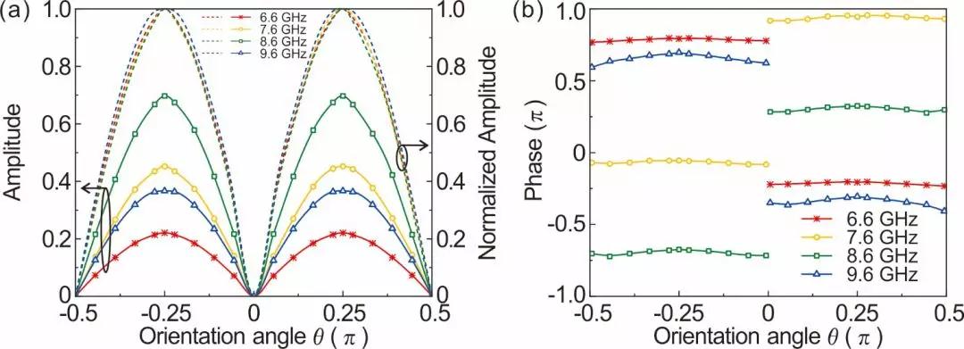图3 控制双曲超材料单元的方向角,可以在宽带范围内调控透射光中与入射光偏振正交的分量的振幅与相位。